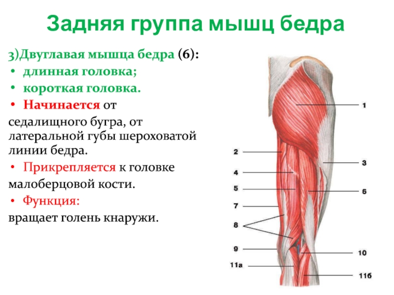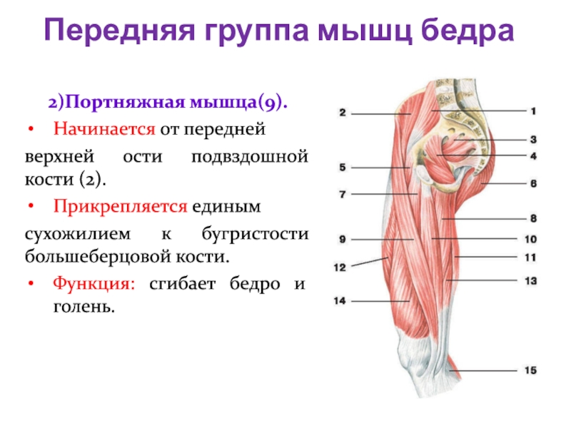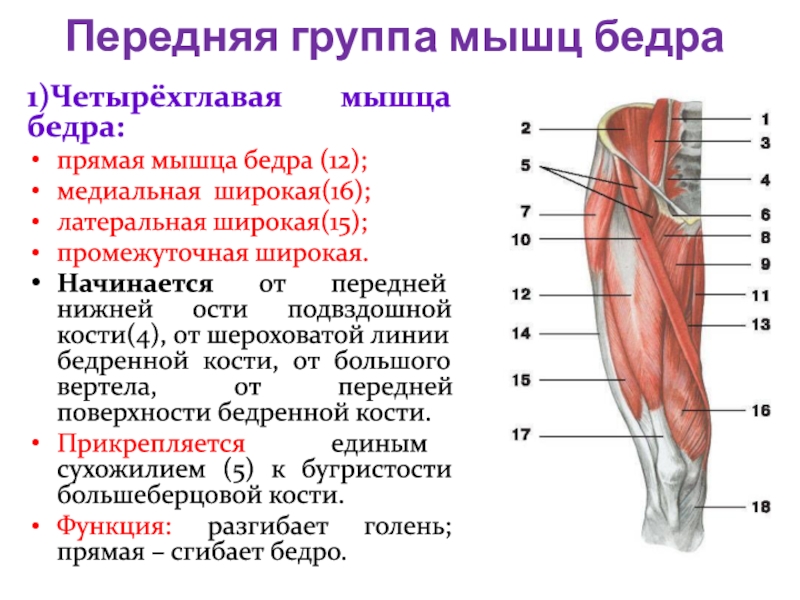 Начинается от передней нижней ости подвздошной кости(4), от шероховатой