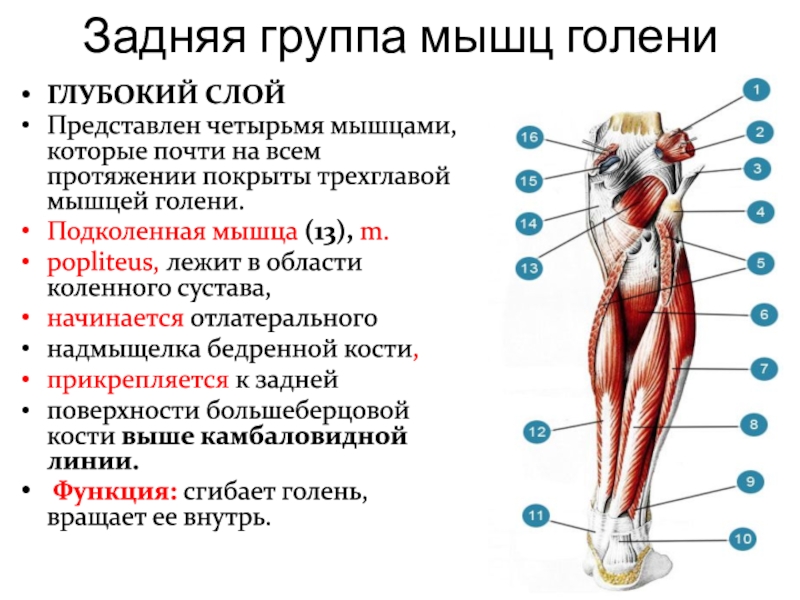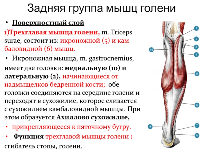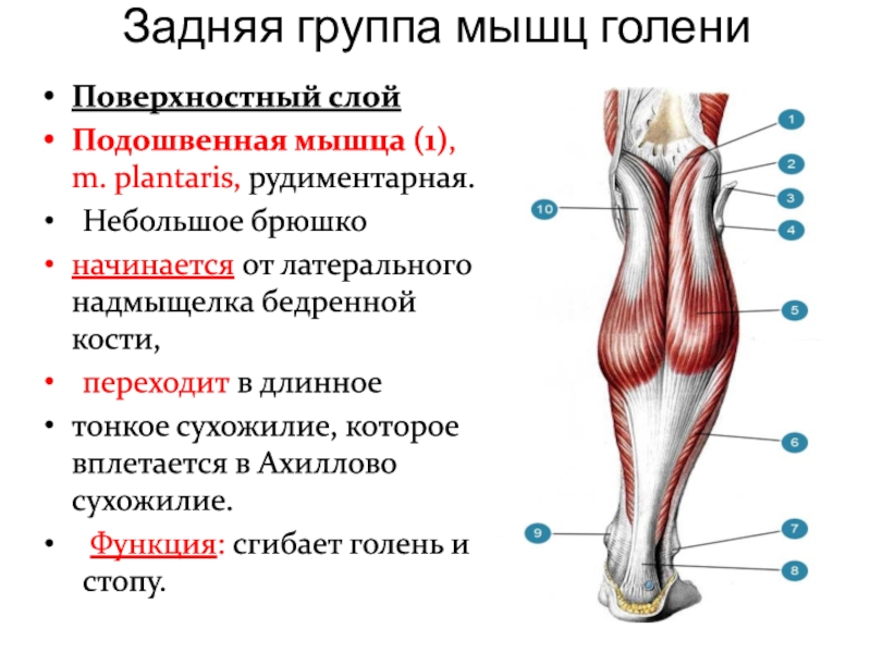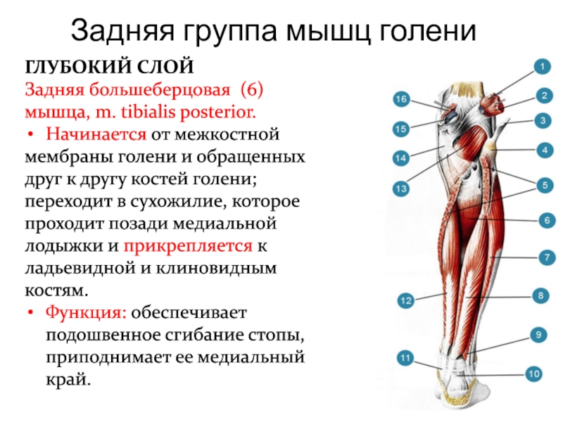 Функция: обеспечивает подошвенное сгибание стопы, приподнимает ее медиальный край.