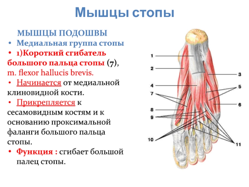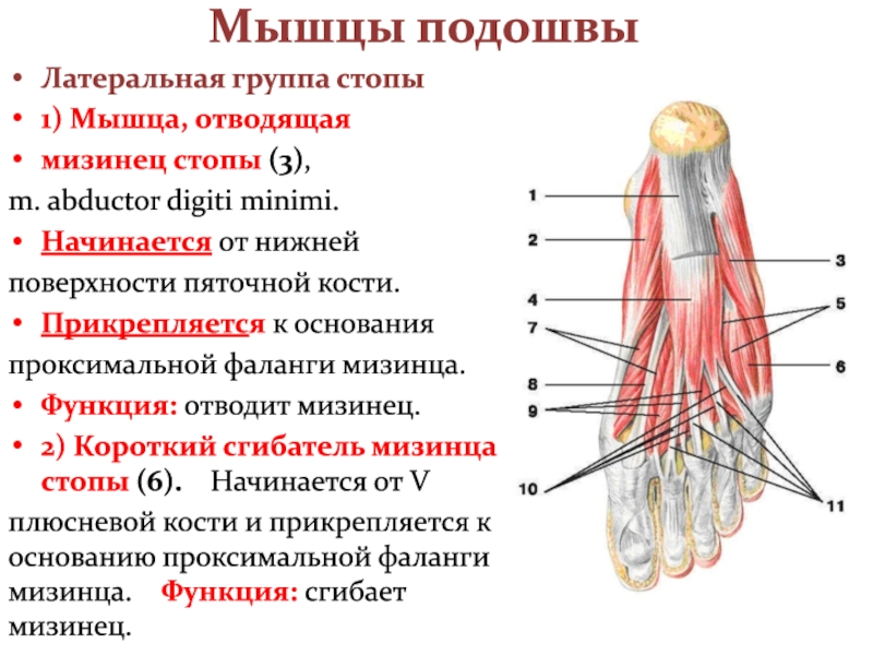 плюсневой кости и прикрепляется к основанию проксимальной фаланги мизинца. Функция: сгибает мизинец.