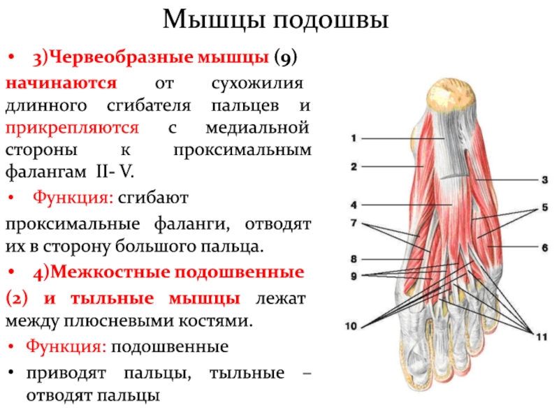начинаются от пяточной кости; прикрепляются двумя пучками к боковым поверхностям средних фаланг пальцев и к проксимальной фаланге большого пальца соответственно.