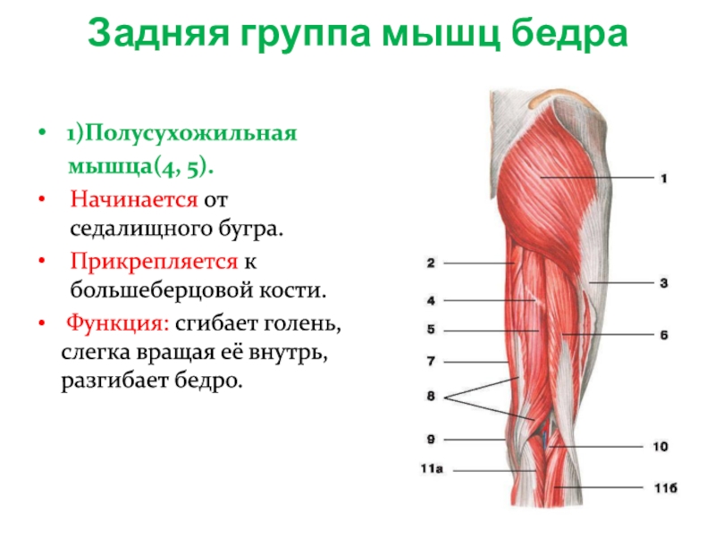 Прикрепляется единым сухожилием (5) к бугристости большеберцовой кости.