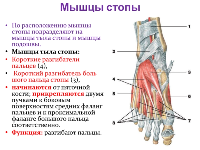 По расположению мышцы стопы подразделяют на мышцы тыла стопы