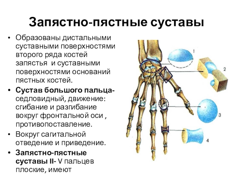 Запястно-пястные суставы II- V пальцев плоские, имеют незначительную подвижность.