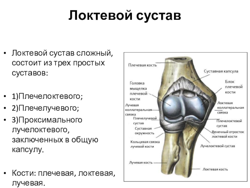 Локтевой сустав сложный, состоит из трех простых суставов: