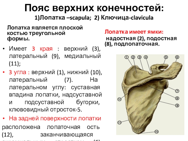 угла : верхний (1), нижний (10), латеральный (7). На латеральном углу: суставная впадина лопатки, надсуставной и подсуставной бугорки, клювовидный отросток-5.