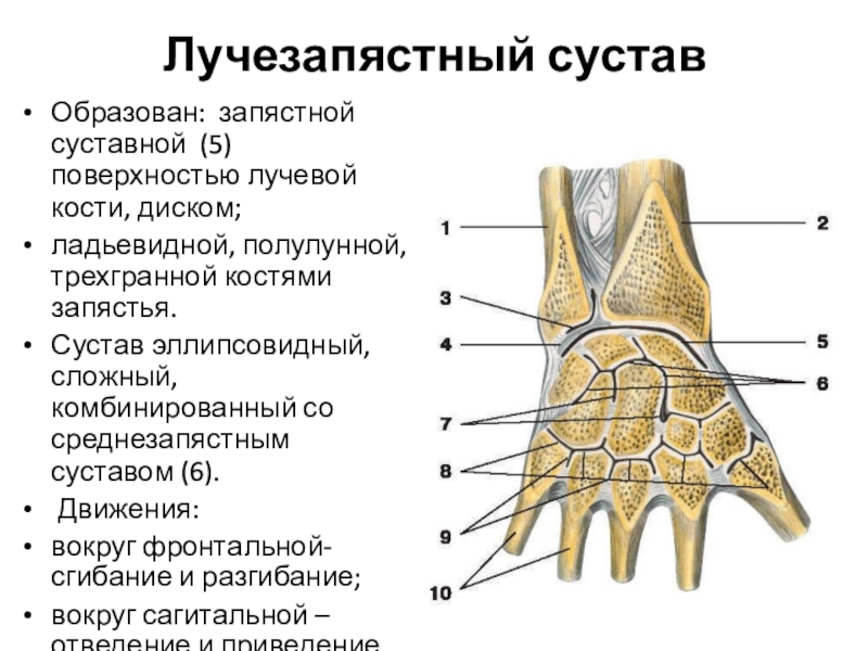 Сустав эллипсовидный, сложный, комбинированный со среднезапястным суставом (6).