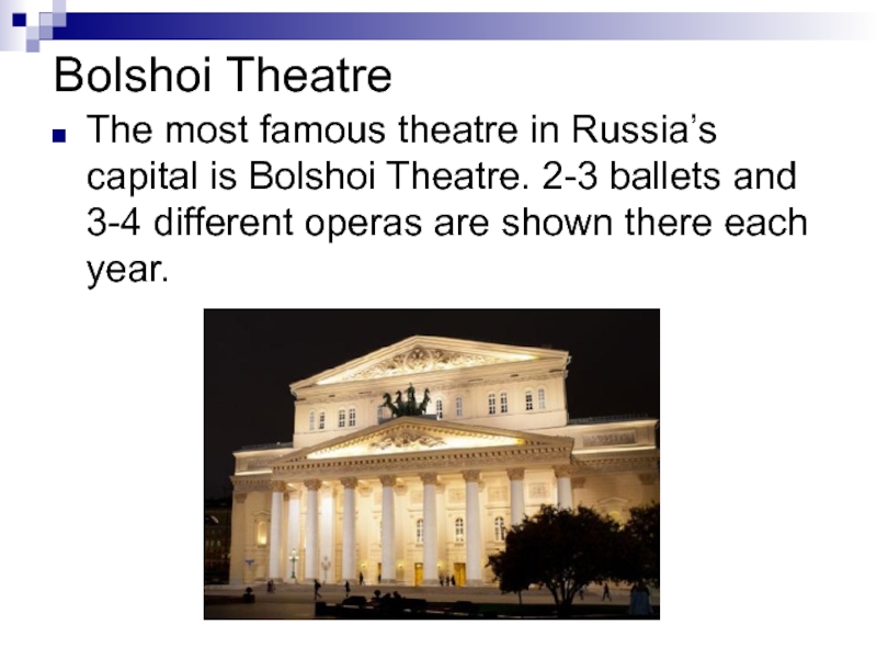 Bolshoi Theatre  The most famous theatre in Russia’s capital is Bolshoi Theatre. 2-3 ballets and 3-4