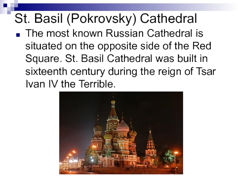 St. Basil (Pokrovsky) Cathedral  The most known Russian Cathedral is situated on the opposite side of