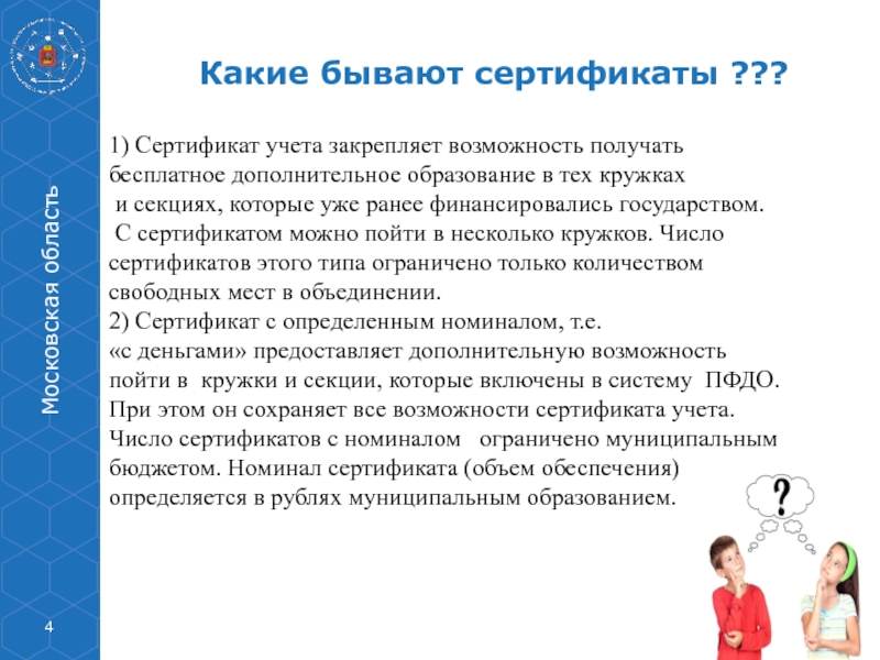 Какие бывают сертификаты ???Московская область1) Сертификат учета закрепляет возможность получать бесплатное дополнительное образование в тех