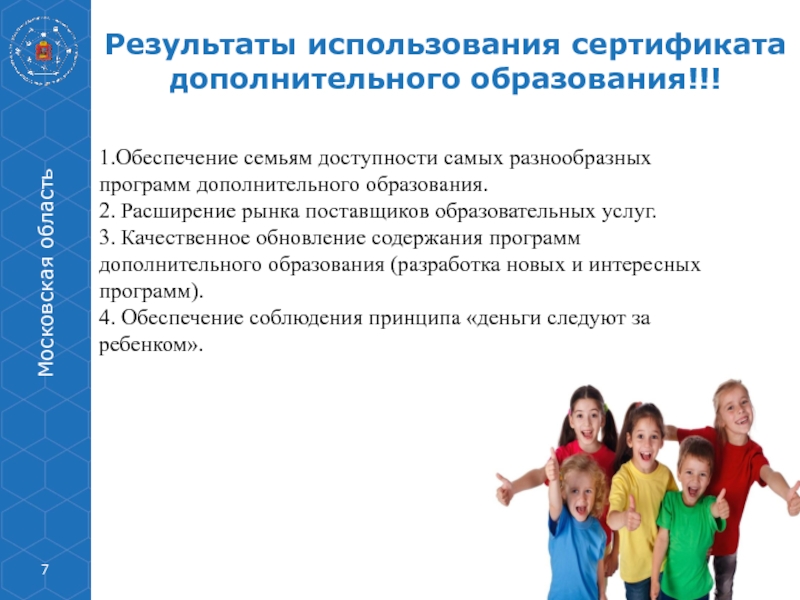 Результаты использования сертификата дополнительного образования!!!Московская область1.Обеспечение семьям доступности самых разнообразных программ дополнительного образования.2. Расширение рынка