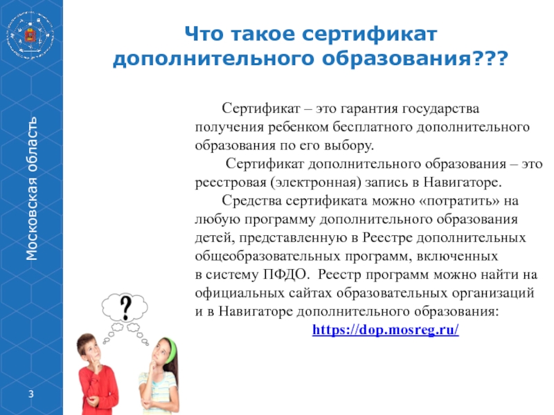Что такое сертификат  дополнительного образования???Московская областьСертификат – это гарантия государства получения ребенком бесплатного дополнительного