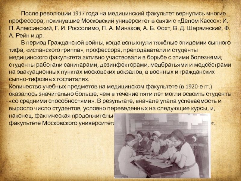 Слайд 18 После революции 1917 года на медицинский факультет вернулись многие профессора,