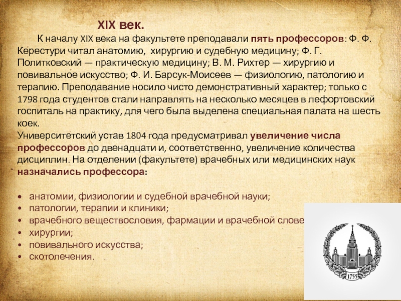 Университетский устав 1804 года предусматривал увеличение числа профессоров до двенадцати и, соответственно, увеличение количества дисциплин. На отделении (факультете) врачебных или медицинских наук назначались профессора: