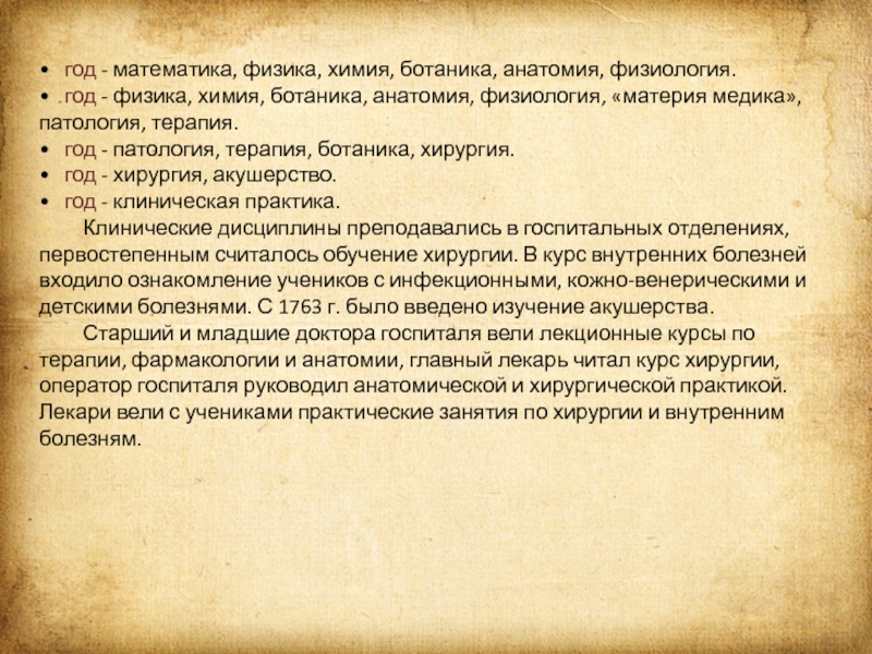 год - физика, химия, ботаника, анатомия, физиология, «материя медика»,