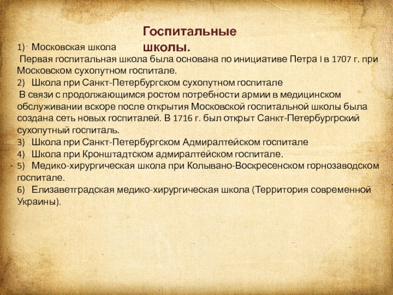 Слайд 19 Госпитальные школы- высшие медицинские учебные заведения России в 18 веке,