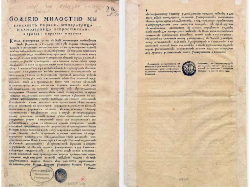 Петром I, были учреждены университет и гимназия для подготовки в России научных кадров. Но академические гимназия и университет с этой задачей не справились. Поэтому М.В. Ломоносов неоднократно ставил вопрос об открытии университета в Москве. Его предложения, сформулированные в письме к И.И. Шувалову, легли в основу проекта Московского университета.