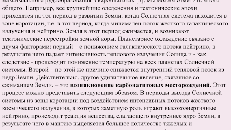 периода максимального рудообразования в карбонатитах [5], мы можем отметить много общего. Например, все крупнейшие оледенения и тектонические эпохи приходятся на тот период в развитии Земли, когда Солнечная система находится в зоне коротации, т.е. в тот период, когда минимален поток жесткого галактического излучения и нейтрино. Земля в этот период сжимается, и возникают тектонические перестройки земной коры. Планетарное охлаждение связано с двумя факторами: первый – с понижением галактического потока нейтрино, в результате чего падает интенсивность теплового излучения Солнца и - как следствие - происходит понижение температуры на всех планетах Солнечной системы. Второй – по этой же причине снижается внутренний тепловой поток из недр Земли. Действительно, другое удивительное явление, связанное со сжиманием Земли, – это возникновение карбонатитовых месторождений. Этот процесс можно представить следующим образом. В периоды выхода Солнечной системы из зоны коротации под воздействием интенсивных потоков жесткого космического излучения, в которых заметную роль играют высокоэнергичные нейтрино, происходит реакция вещества, слагающего внутреннее ядро Земли, в результате чего в мантию выделяется большое количество тяжелых и сверхтяжелых атомных ядер, которое направляется к литосфере.