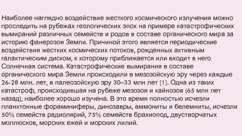 в составе органического мира за историю фанерозоя Земли. Причиной этого является периодические воздействия жестких космических потоков, рожденных активным галактическим диском, к которому приближается или входит в него Солнечная система. Катастрофические вымирания в составе органического мира Земли происходили в мезозойскую эру через каждые 26-28 млн. лет, в палеозойскую эру 30–33 млн лет [1]. Одна из таких катастроф, происходившая на рубеже мезозоя и кайнозоя (65 млн лет назад), наиболее хорошо изучена. В это время полностью исчезли планктонные фораминиферы, динозавры, аммониты и белемниты, исчезли 50% семейств радиолярий, 75% семейств брахиопод, двустворчатых моллюсков, морских ежей и морских лилий.