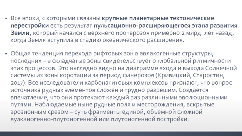 Общая тенденция перехода рифтовых зон в авлакогенные структуры, последних – в складчатые зоны свидетельствует о глобальной ритмичности этих процессов. Это наглядно видно на диаграмме входа и выхода Солнечной системы из зоны коротации за период фанерозоя (Кривицкий, Старостин, 2017). Все исследователи карбонатитовых комплексов признают, что вопрос источника рудных элементов сложен и трудно разрешим. Создается впечатление, что они протекают каждый раз различными эволюционными путями. Наблюдаемые ныне рудные поля и месторождения, вскрытые эрозионным срезом – суть фрагменты единой, объемной сложной вулканогенно-плутоногенной или плутоногенной постройки.