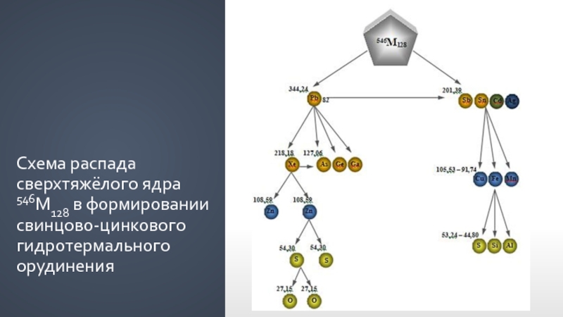 Слайд 85Схема распада сверхтяжёлого ядра 546M128 в формировании свинцово-цинкового гидротермального орудинения