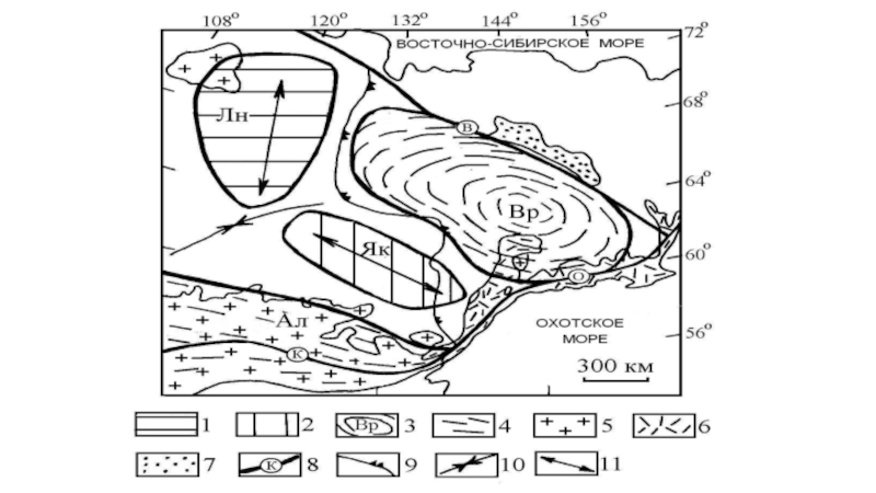 Дл – Дулганахский; 5 – глубинные ограничения кратона (сутуры): Восточноверхоянская (В) и Охотоморская (О); 6 – глубинные разломы: З – Западноверхоянский, П – Сеттедабанский,