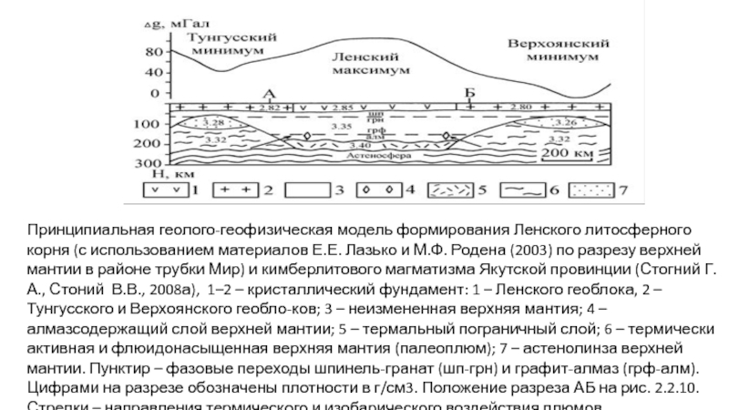 Слайд 83Принципиальная геолого-геофизическая модель формирования Ленского литосферного корня (с использованием материалов
