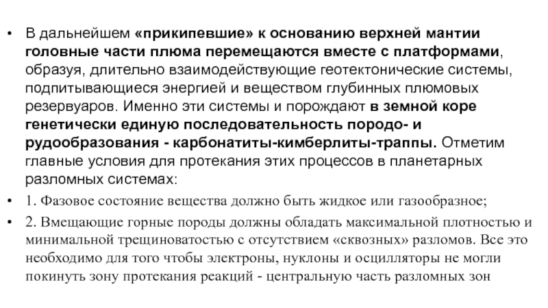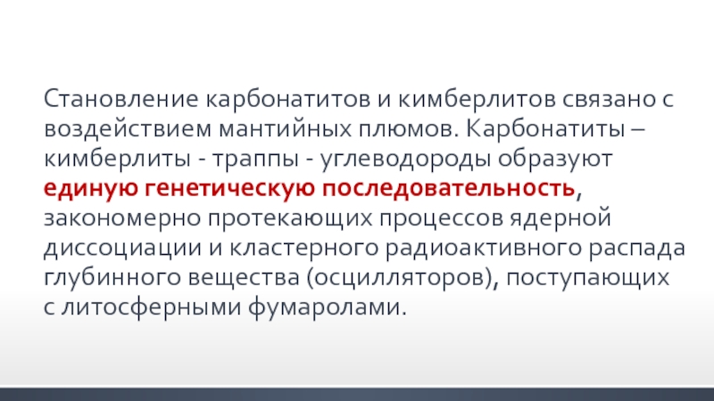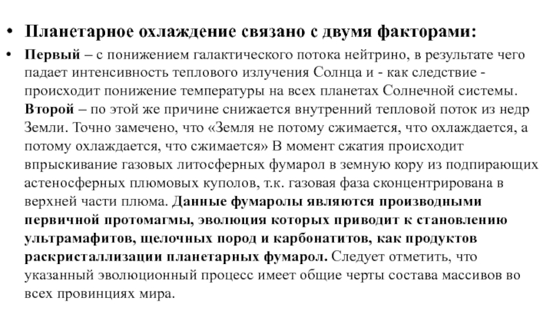 Солнца и - как следствие - происходит понижение температуры на всех планетах Солнечной системы. Второй – по этой же причине снижается внутренний тепловой поток из недр Земли. Точно замечено, что «Земля не потому сжимается, что охлаждается, а потому охлаждается, что сжимается» В момент сжатия происходит впрыскивание газовых литосферных фумарол в земную кору из подпирающих астеносферных плюмовых куполов, т.к. газовая фаза сконцентрирована в верхней части плюма. Данные фумаролы являются производными первичной протомагмы, эволюция которых приводит к становлению ультрамафитов, щелочных пород и карбонатитов, как продуктов раскристаллизации планетарных фумарол. Следует отметить, что указанный эволюционный процесс имеет общие черты состава массивов во всех провинциях мира.
