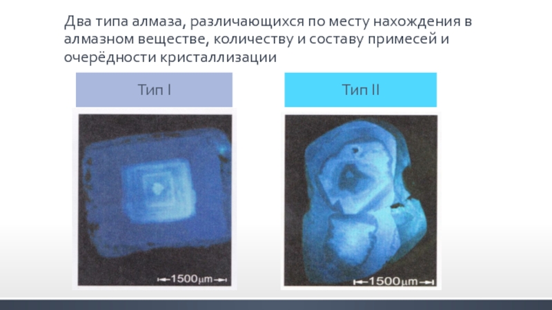 Слайд 74Два типа алмаза, различающихся по месту нахождения в алмазном веществе,