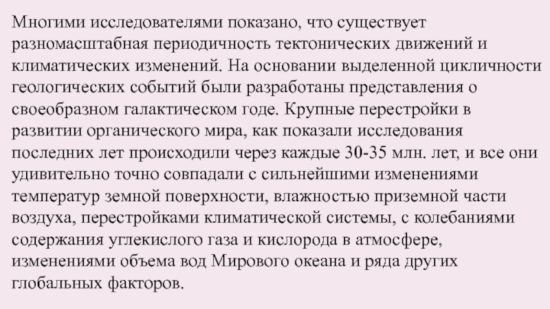 представления о своеобразном галактическом годе. Крупные перестройки в развитии органического мира, как показали исследования последних лет происходили через каждые 30-35 млн. лет, и все они удивительно точно совпадали с сильнейшими изменениями температур земной поверхности, влажностью приземной части воздуха, перестройками климатической системы, с колебаниями содержания углекислого газа и кислорода в атмосфере, изменениями объема вод Мирового океана и ряда других глобальных факторов.