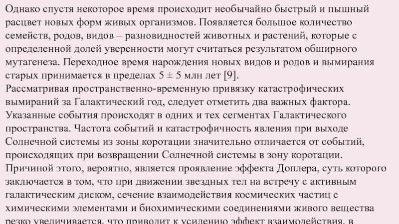 Рассматривая пространственно-временную привязку катастрофических вымираний за Галактический год, следует отметить два важных фактора. Указанные события происходят в одних и тех сегментах Галактического пространства. Частота событий и катастрофичность явления при выходе Солнечной системы из зоны коротации значительно отличается от событий, происходящих при возвращении Солнечной системы в зону коротации. Причиной этого, вероятно, является проявление эффекта Доплера, суть которого заключается в том, что при движении звездных тел на встречу с активным галактическим диском, сечение взаимодействия космических частиц с химическими элементами и биохимическими соединениями живого вещества резко увеличивается, что приводит к усилению эффект взаимодействия, в особенности, это отражается на процессах мутагенеза живого вещества.