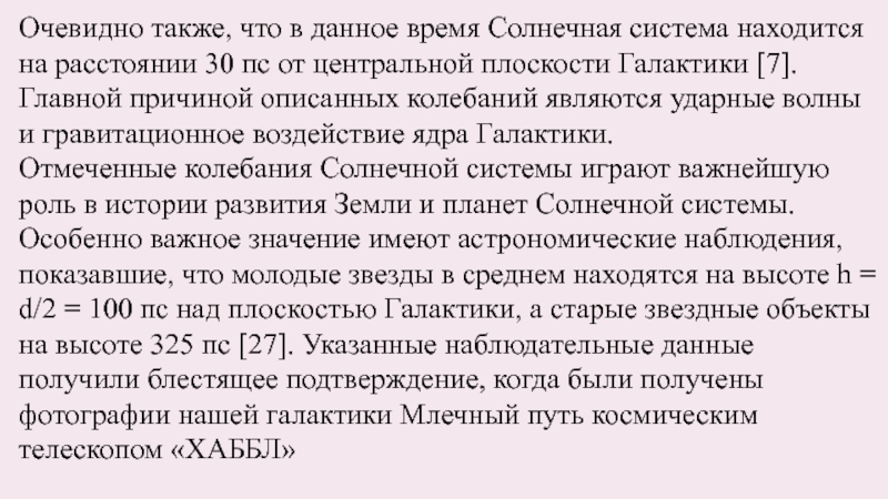 Отмеченные колебания Солнечной системы играют важнейшую роль в истории развития Земли и планет Солнечной системы. Особенно важное значение имеют астрономические наблюдения, показавшие, что молодые звезды в среднем находятся на высоте h = d/2 = 100 пс над плоскостью Галактики, а старые звездные объекты на высоте 325 пс [27]. Указанные наблюдательные данные получили блестящее подтверждение, когда были получены фотографии нашей галактики Млечный путь космическим телескопом «ХАББЛ»