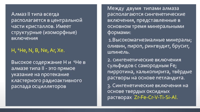 Алмаз II типа всегда располагается в центральной части кристаллов. Имеет