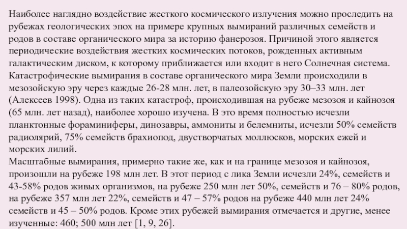 в составе органического мира за историю фанерозоя. Причиной этого является периодические воздействия жестких космических потоков, рожденных активным галактическим диском, к которому приближается или входит в него Солнечная система. Катастрофические вымирания в составе органического мира Земли происходили в мезозойскую эру через каждые 26-28 млн. лет, в палеозойскую эру 30–33 млн. лет (Алексеев 1998). Одна из таких катастроф, происходившая на рубеже мезозоя и кайнозоя (65 млн. лет назад), наиболее хорошо изучена. В это время полностью исчезли планктонные фораминиферы, динозавры, аммониты и белемниты, исчезли 50% семейств радиолярий, 75% семейств брахиопод, двустворчатых моллюсков, морских ежей и морских лилий.