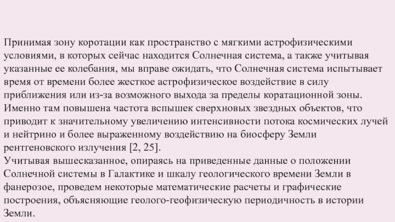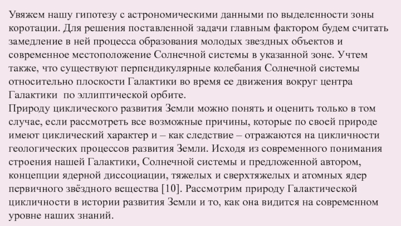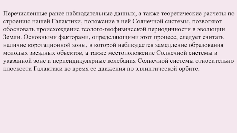 геолого-геофизической периодичности в эволюции Земли. Основными факторами, определяющими этот процесс, следует считать наличие коротационной зоны, в которой наблюдается замедление образования молодых звездных объектов, а также местоположение Солнечной системы в указанной зоне и перпендикулярные колебания Солнечной системы относительно плоскости Галактики во время ее движения по эллиптической орбите.
