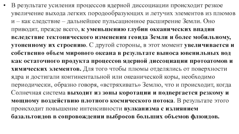 за пределами которой протекает активная космическая жизнь- возникают звезды и экзопланеты и все пространство насыщено плотными нейтронными полями. Солнечная система, вращаясь внутри Млечного пути в течении 105 млн.л. (галактический год), циклически входит и выходит из этой зоны (рис.). В период нахождения вне зоны коротации под воздействием космических нейтронных потоков активизируются процессы ядерного распада и трансмутации элементов. В результате Земля расширяется и возникает планетарная система расколов. Это приводит к увеличению обьема Земли в зоне астеносферы и нижней мантии. В астеносфере накапливается большое количество летучих элементов, нейтронов, протонов и электронов. В этом ядерно-кластерном субстрате сохраняется и большое количество тяжелых и сверхтяжелых осциляторов. Весь этот комплексный гетерогенный флюид внедряется в земную кору.