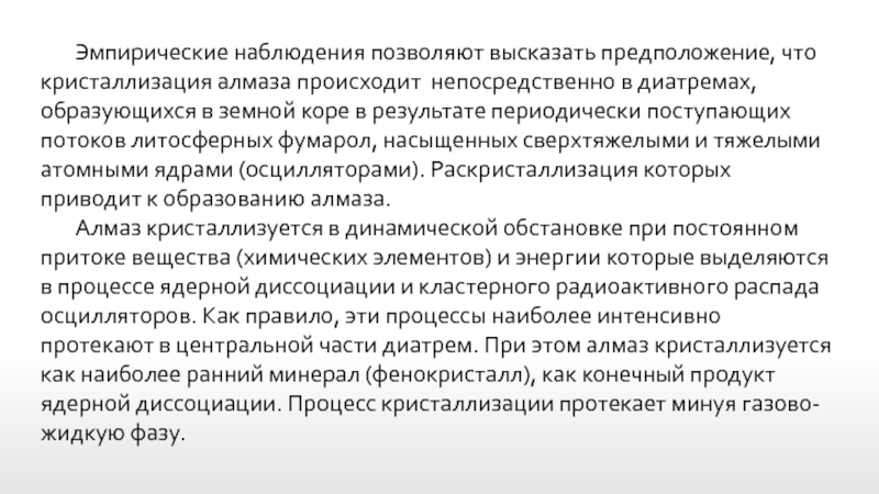 потоков литосферных фумарол, насыщенных сверхтяжелыми и тяжелыми атомными ядрами (осцилляторами). Раскристаллизация которых приводит к образованию алмаза.