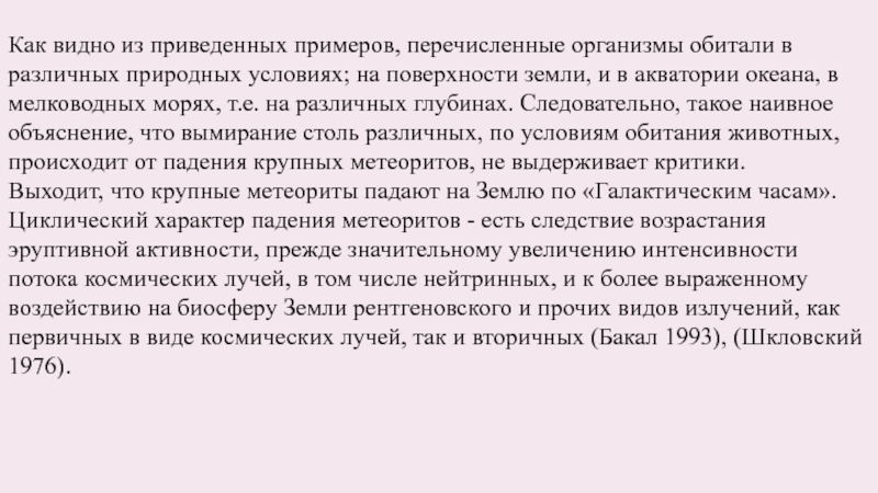 мелководных морях, т.е. на различных глубинах. Следовательно, такое наивное объяснение, что вымирание столь различных, по условиям обитания животных, происходит от падения крупных метеоритов, не выдерживает критики.