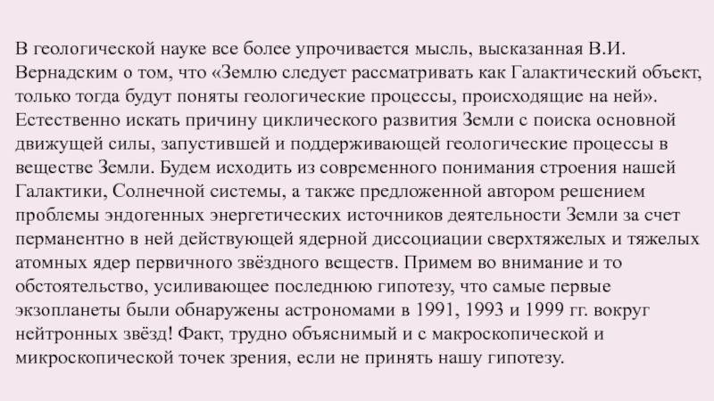 Естественно искать причину циклического развития Земли с поиска основной движущей силы, запустившей и поддерживающей геологические процессы в веществе Земли. Будем исходить из современного понимания строения нашей Галактики, Солнечной системы, а также предложенной автором решением проблемы эндогенных энергетических источников деятельности Земли за счет перманентно в ней действующей ядерной диссоциации сверхтяжелых и тяжелых атомных ядер первичного звёздного веществ. Примем во внимание и то обстоятельство, усиливающее последнюю гипотезу, что самые первые экзопланеты были обнаружены астрономами в 1991, 1993 и 1999 гг. вокруг нейтронных звёзд! Факт, трудно объяснимый и с макроскопической и микроскопической точек зрения, если не принять нашу гипотезу.