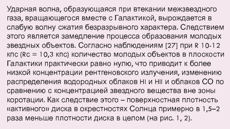 является замедление процесса образования молодых звездных объектов. Согласно наблюдениям [27] при R 10-12 кпс (Rс = 10,3 кпс) количество молодых объектов в плоскости Галактики практически равно нулю, что приводит к более низкой концентрации рентгеновского излучения, изменению распределения водородных облаков HI и HII и облаков СО по сравнению с концентрацией звездного вещества вне зоны коротации. Как следствие этого – поверхностная плотность «активного» диска в окрестностях Солнца примерно в 1,5–2 раза меньше плотности диска в целом (на рис. 1, 2).