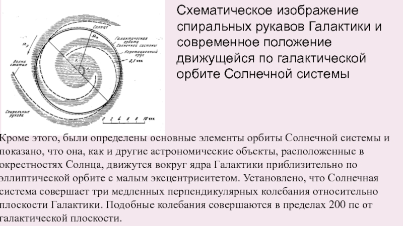 орбиты Солнечной системы и показано, что она, как и другие астрономические объекты, расположенные в окрестностях Солнца, движутся вокруг ядра Галактики приблизительно по эллиптической орбите с малым эксцентриситетом. Установлено, что Солнечная система совершает три медленных перпендикулярных колебания относительно плоскости Галактики. Подобные колебания совершаются в пределах 200 пс от галактической плоскости.
