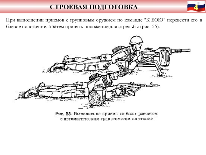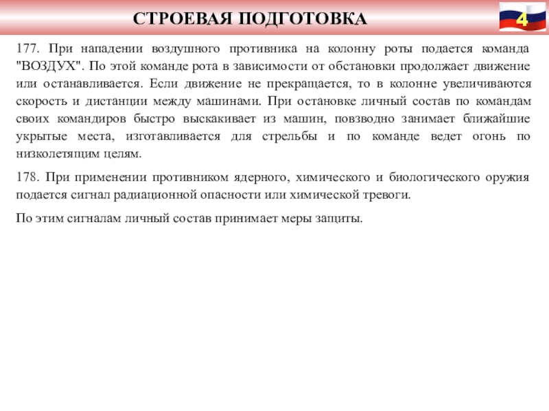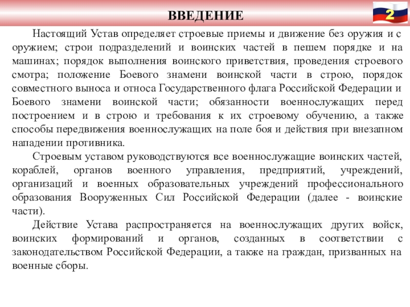 пешем порядке и на машинах; порядок выполнения воинского приветствия, проведения строевого смотра; положение Боевого знамени воинской части в строю, порядок совместного выноса и относа Государственного флага Российской Федерации и Боевого знамени воинской части; обязанности военнослужащих перед построением и в строю и требования к их строевому обучению, а также способы передвижения военнослужащих на поле боя и действия при внезапном нападении противника.