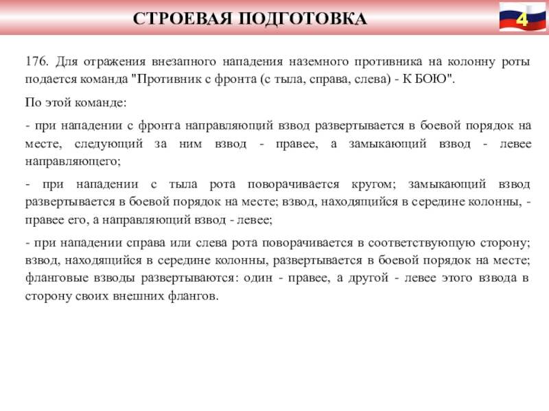 - при нападении с тыла рота поворачивается кругом; замыкающий взвод развертывается в боевой порядок на месте; взвод, находящийся в середине колонны, - правее его, а направляющий взвод - левее;