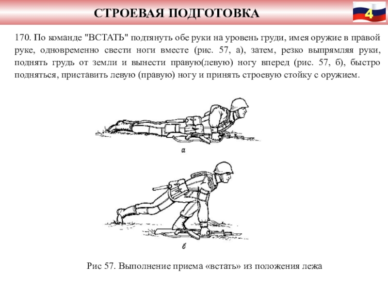(рис. 57, а), затем, резко выпрямляя руки, поднять грудь от земли и вынести правую(левую) ногу вперед (рис. 57, б), быстро подняться, приставить левую (правую) ногу и принять строевую стойку с оружием.