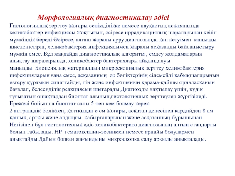 маңызды. Биопсиялық материалдың микроскопиялық зерттеу хеликобактерия инфекцияларын ғана емес, асқазанның әр бөліктерінің сілемейлі қабықшаларының өзгеру құрамын сипаттайды, тін және инфекцияның қарама-қайшы орналасқанын бағалап, белсенділік реакциясын шығарады.Диагнозды нақтылау үшін, күдік туғызатын ошақтардан биоптат алынып,гистологиялық зерттеулер жүргізіледі. Ережесі бойынша биоптат саны 5-тен кем болмау керек: