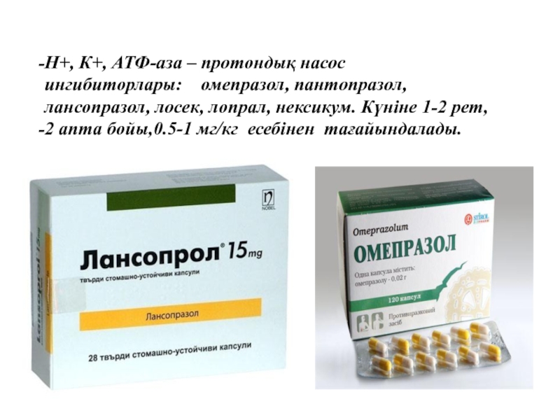 лансопразол, лосек, лопрал, нексикум. Күніне 1-2 рет,