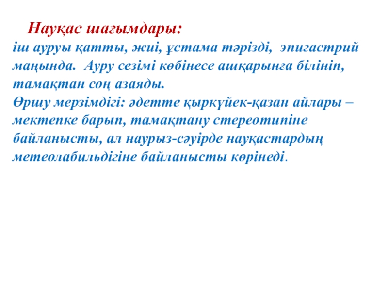 Өршу мерзімдігі: әдетте қыркүйек-қазан айлары – мектепке барып, тамақтану стереотипіне байланысты, ал наурыз-сәуірде науқастардың метеолабильдігіне байланысты көрінеді.