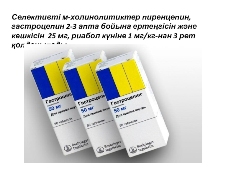 Слайд 29Селективті м-холинолитиктер пиренцепин, гастроцепин 2-3 апта бойына ертеңгісін және кешкісін