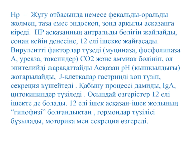 кейін денесіне, 12 елі ішекке жайғасады. Вирулентті факторлар түзеді (муциназа, фосфолипаза А, уреаза, токсиндер) СО2 және аммиак бөлініп, ол эпителийді жарақаттайды Асқазан рН (қышқылдығы) жоғарылайды, J-клеткалар гастринді көп түзіп, секреция күшейтеді . Қабыну процессі дамиды, ІgA, цитокининдер түзіледі . Осындай өзгерістер 12 елі ішекте де болады. 12 елі ішек асқазан-ішек жолының “гипофизі” болғандықтан , гормондар түзілісі бұзылады, моторика мен секреция өзгереді.