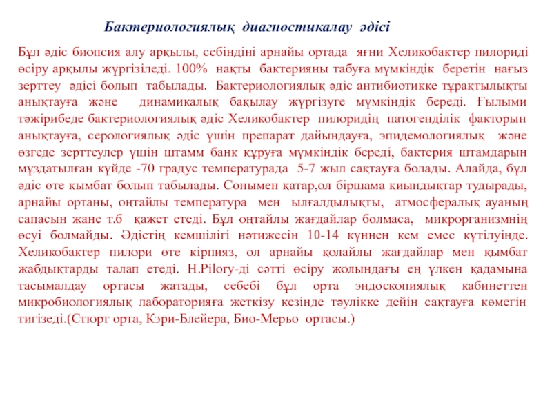 биопсия алу арқылы, себіндіні арнайы ортада яғни Хеликобактер пилориді өсіру арқылы жүргізіледі. 100% нақты бактерияны табуға мүмкіндік беретін нағыз зерттеу әдісі болып табылады. Бактериологиялық әдіс антибиотикке тұрақтылықты анықтауға және динамикалық бақылау жүргізуге мүмкіндік береді. Ғылыми тәжірибеде бактериологиялық әдіс Хеликобактер пилоридің патогенділік факторын анықтауға, серологиялық әдіс үшін препарат дайындауға, эпидемологиялық және өзгеде зерттеулер үшін штамм банк құруға мүмкіндік береді, бактерия штамдарын мұздатылған күйде -70 градус температурада 5-7 жыл сақтауға болады. Алайда, бұл әдіс өте қымбат болып табылады. Сонымен қатар,ол біршама қиындықтар тудырады,арнайы ортаны, оңтайлы температура мен ылғалдылықты, атмосфералық ауаның сапасын жане т.б қажет етеді. Бұл оңтайлы жағдайлар болмаса, микрорганизмнің өсуі болмайды. Әдістің кемшілігі нәтижесін 10-14 күннен кем емес күтілуінде. Хеликобактер пилори өте кірпияз, ол арнайы қолайлы жағдайлар мен қымбат жабдықтарды талап етеді. H.Pilory-ді сәтті өсіру жолындағы ең үлкен қадамына тасымалдау ортасы жатады, себебі бұл орта эндоскопиялық кабинеттен микробиологиялық лабораторияға жеткізу кезінде тәулікке дейін сақтауға көмегін тигізеді.(Стюрт орта, Кэри-Блейера, Био-Мерьо ортасы.)