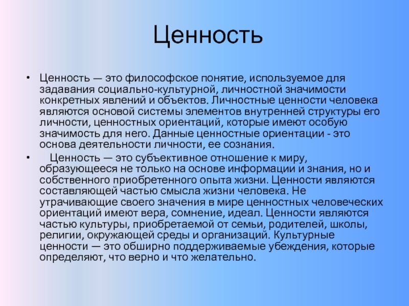 Ценность — это субъективное отношение к миру, образующееся не только на основе информации и знания, но и собственного приобретенного опыта жизни. Ценности являются составляющей частью смысла жизни человека. Не утрачивающие своего значения в мире ценностных человеческих ориентаций имеют вера, сомнение, идеал. Ценности являются частью культуры, приобретаемой от семьи, родителей, школы, религии, окружающей среды и организаций. Культурные ценности — это обширно поддерживаемые убеждения, которые определяют, что верно и что желательно.